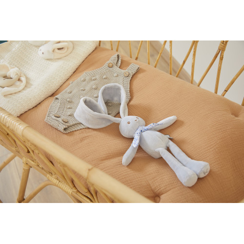 Este alegre conejito azul Kaloo tiene orejas tan largas que puedes colgarlo donde quieras para guardarlo y no perderlo nunca. Puede hacer de todo con él: hacer el pino, columpiarse, colgarse de un tendedero e incluso columpiarse en la luna. Con sus largas orejas, envuelve a los bebés en tiernos abrazos y comparte dulces momentos con ellos. Se puede lavar a máquina. Se presenta en una bonita caja de regalo que puedes personalizar con un mensaje en el espacio disponible bajo la tapa. Para un gesto más amable con el planeta, nuestras marionetas Lapinoo contienen al menos un 97 % de materiales y relleno reciclados.