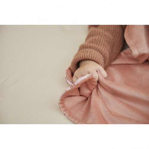 Aquí tienes una encantadora manta de peluche Lapinoo con orejas largas que te permiten colgarla donde quieras y no perderla nunca. Hecha de materiales suaves y delicados (pana y microterciopelo), envuelve al bebé en una suave calidez, ideal para calmarlo y reconfortarlo. Gracias a sus generosas dimensiones de 80 x 70 cm, se puede usar en todas partes: en casa para acurrucarlo, en los paseos para protegerlo del frío o en el cochecito para una sensación de bienestar. Esta manta Lapinoo también es un compañero de peluche para el bebé gracias a su adorable conejito de peluche que invita a los abrazos y a la unión. Su bufanda delicadamente anudada, a juego con la manta, añade un toque de elegancia. Con sus largas orejas para atar, la manta tiene un ingenioso sistema de sujeción para acompañar al bebé en todas sus aventuras. Su refinado diseño en color terracota, con una textura suave y reconfortante en un lado y un lado estampado en el otro, combina elegancia y fantasía, fiel al tierno mundo de Kaloo. Tan reconfortante como un peluche, esta manta protege, abriga y reconforta, convirtiéndose en un preciado recuerdo para los padres. Esta manta Lapinoo está hecha con al menos un 97 % de materiales y relleno reciclados. Apta para bebés desde su nacimiento, se puede lavar a máquina a 30 °C en ciclo delicado para un cuidado fácil.