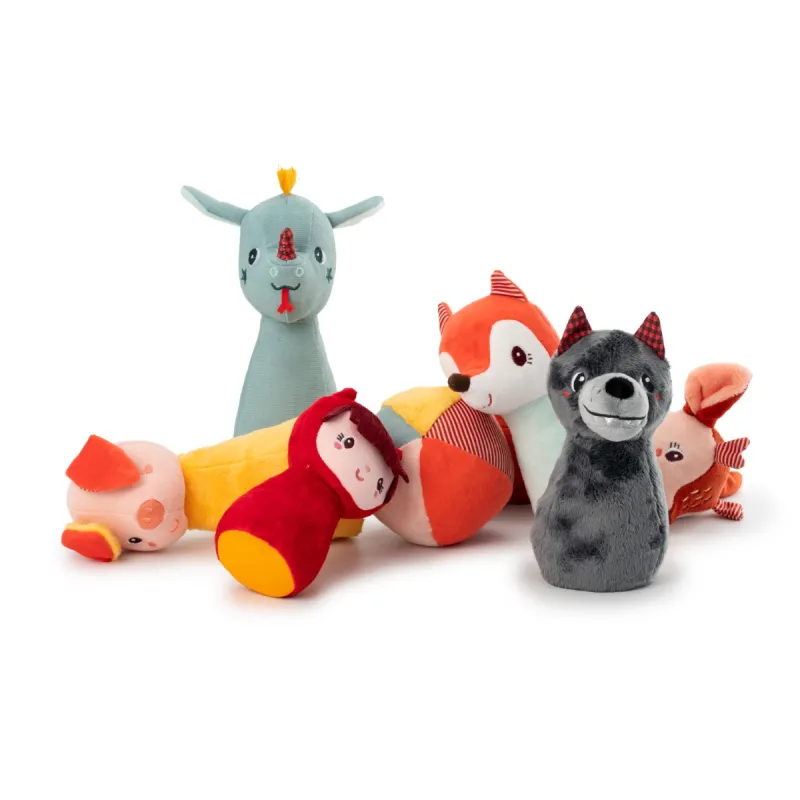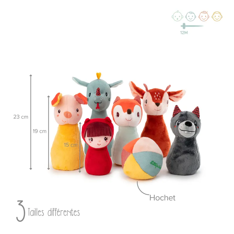 ¿Quién puede derribar a esta alegre pandilla de amigos del bosque de un solo lanzamiento? Este colorido juego de bolos consta de 6 bolos suaves y una pelota sonajero suave de tela. Para jugar en interiores sin dañar nada y convertirse en una futura estrella del bowling.