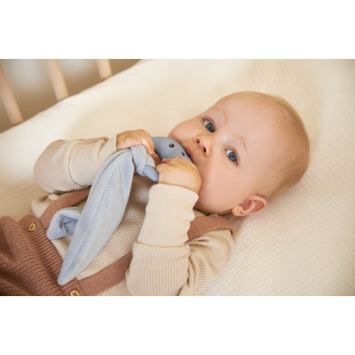 Ofrece esta magnífica caja regalo de nacimiento compuesta por 3 imprescindibles, especialmente diseñada para el bebé. Esta caja incluye un edredón de conejo, un mordedor de silicona y unas pequeñas zapatillas de conejo, todo en color azul. El edredón azul es un alegre Lapinoo, el compañero ideal para acompañar al bebé durante sus días y noches. Confeccionado en bimateriales con un lado en pana y otro lado en tejido ligero (viscosa), ofrece un confort óptimo para el bebé. El edredón de conejo mide 30 cm y se distingue por sus largas e irresistibles orejas. Estos te permiten colgarlo en cualquier lugar, teniéndolo siempre a mano. Las orejas también son fáciles de agarrar para las manos pequeñas. El mordedor de silicona en forma de conejo es perfecto para aliviar la dentición. Su forma redondeada y flexible se adapta a bocas pequeñas gracias a sus dimensiones de 7 cm de alto y 8 cm de ancho. Diseñado para favorecer el bienestar del bebé, tiene dos texturas: una superficie lisa en la parte delantera, con carita de conejo, y unos nudos en la parte trasera, que favorecen la aparición de los primeros dientes y masajean las encías doloridas. Las orejas grandes y suaves (16 cm) de este mordedor Kaloo pueden ser agarradas fácilmente por el bebé y colgadas donde quiera que vaya. Además, las orejas son desmontables, lo que las hace fáciles de lavar. Las pantuflas de bebé de color azul, a juego con el edredón y el mordedor, son aptas para niños de 0 a 6 meses (miden 11 cm de largo). Realizados en dos materiales, con pana y ante, son cómodos y adorables para los pies del bebé con sus orejitas de conejo. Harán las delicias de toda la familia, lucidas durante una sesión de fotos para anunciar el nacimiento del pequeño, por ejemplo. Estos 3 imprescindibles se presentan en una bonita caja (26 x 6 x 23 cm) que se puede personalizar con un mensaje que se puede escribir en el espacio disponible bajo la tapa. Para mantener su contenido: el edredón y el mordedor se pueden lavar a máquina por separado a 30°, sin utilizar suavizantes, quitamanchas ni otros aditivos. Las zapatillas deben lavarse a mano. ¡Esta es la caja de regalo ideal para un nacimiento!
