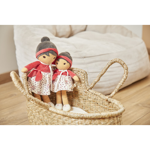 ¡Qué romántico! Conoce a Émilie, una encantadora muñeca de tela, en su tamaño de 25 cm. Apta para bebés desde el nacimiento, forma parte de la colección de muñecas Tendresse de Kaloo. La muñeca Emilie lleva una preciosa falda de volantes decorada con corazones, que refleja su alegría de vivir y su amor por la vida. Con su adorable envoltorio de corazón rojo, a juego con su diadema, está lista para todas las aventuras. En sus pies, unas cómodas zapatillas le permiten caminar por las calles y apreciar su auténtica belleza. Émilie es una muñequita que encarna la libertad y a la que le encanta celebrar la belleza de la vida. Muy suave, es perfecto para que los más pequeños lo abrazen y lo carguen. ¡A todos nos encanta su pequeño y elegante moño y su elegante cinta alrededor de su cuello! Para llevar a todas partes a vivir las historias más dulces, ella es una amiga siempre dispuesta a capturar cada momento. En la parte posterior de esta muñeca marrón encontrarás una cinta cosida que te permitirá escribir el nombre de su pequeña dueña. Presentado en su bonita caja, Émilie es un regalo de nacimiento original y tierno. También es perfecta como primera muñeca para estimular la imaginación de los más pequeños. El microterciopelo y el acolchado que lo compone están fabricados con poliéster reciclado. Lavable a máquina, ¡esta adorable muñequita está lista para ser adoptada!